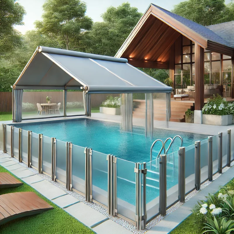 Le préau permet de conserver une vue dégagée et un accès facile à la piscine tout en offrant une certaine protection contre les intempéries. Contrairement à un abri rigide, il est plus léger, plus facile à installer, et donne un aspect plus naturel à l’espace piscine.